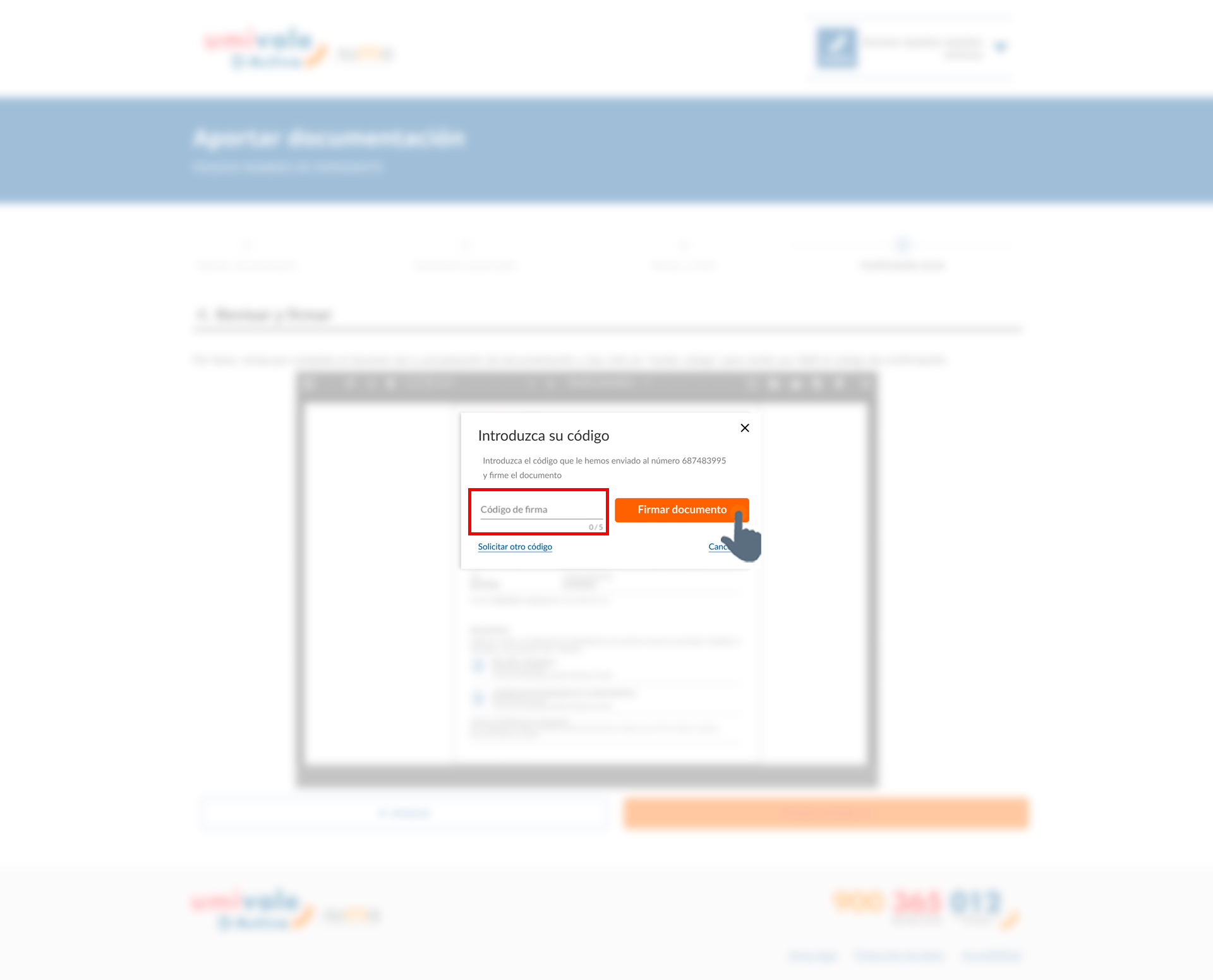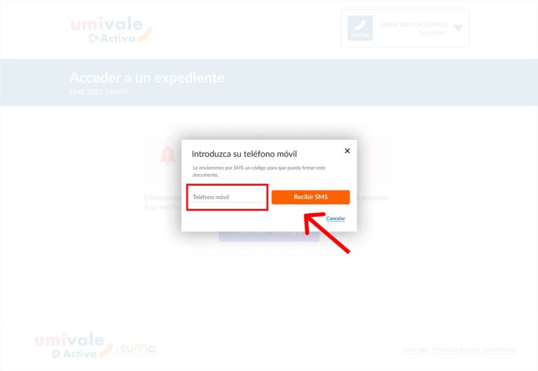 Al hacer clic en el botón "Recibir código" aparecerá una ventana emergente solicitando su número de teléfono. Introdúzcalo y pulse el botón naranja 'Recibir SMS' para obtener el código de verificación necesario para firmar el documento.
