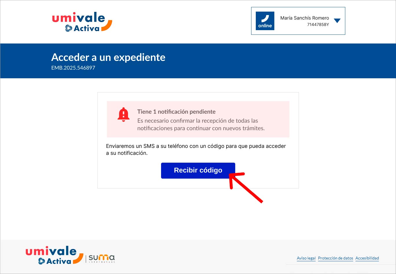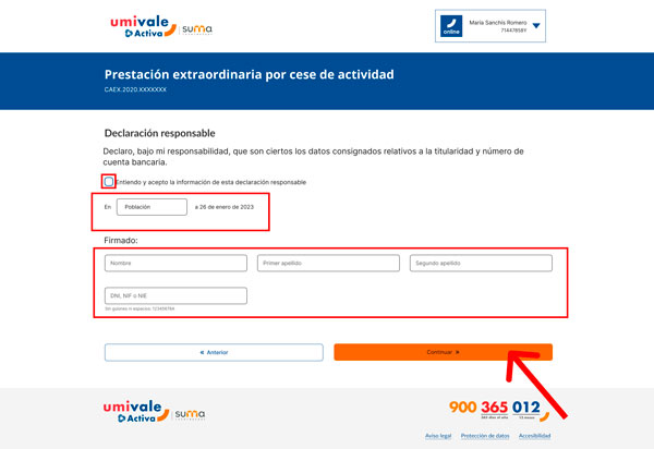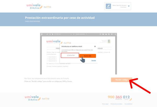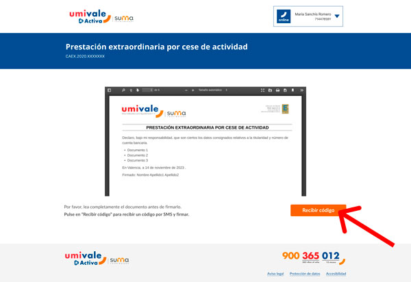 Una vez que hayas completado todos los campos y aceptado la declaración responsable, haz clic en el botón naranja "Continuar" para finalizar el proceso de solicitud de la prestación.Paso 8: Lea completamente el documento antes de firmarlo. Pulse en el botón de "Recibir código" para recibir un código por SMS y firmar.