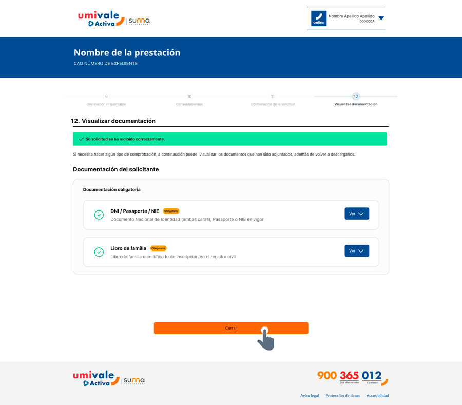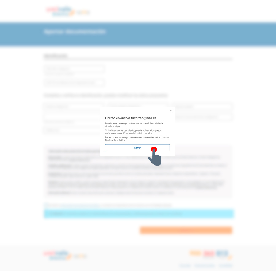 Al hacer clic en «Continuar», el sistema mostrará una ventana emergente de aviso (pop-up) informando a la persona usuaria de que ha recibido un email en la cuenta de correo indicada para retomar la solicitud. Al pulsar «Cerrar», la navegación finalizará en esta pantalla.